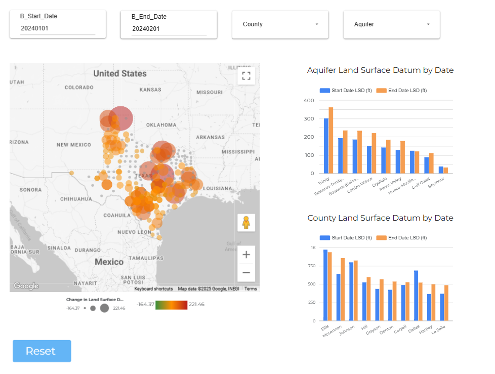 We provide interactive dashboards and dynamic maps that turn complex water data into clear, actionable insights. Our platform enables near real-time monitoring of wells, aquifers, and county-level water metrics for smarter decision-making.